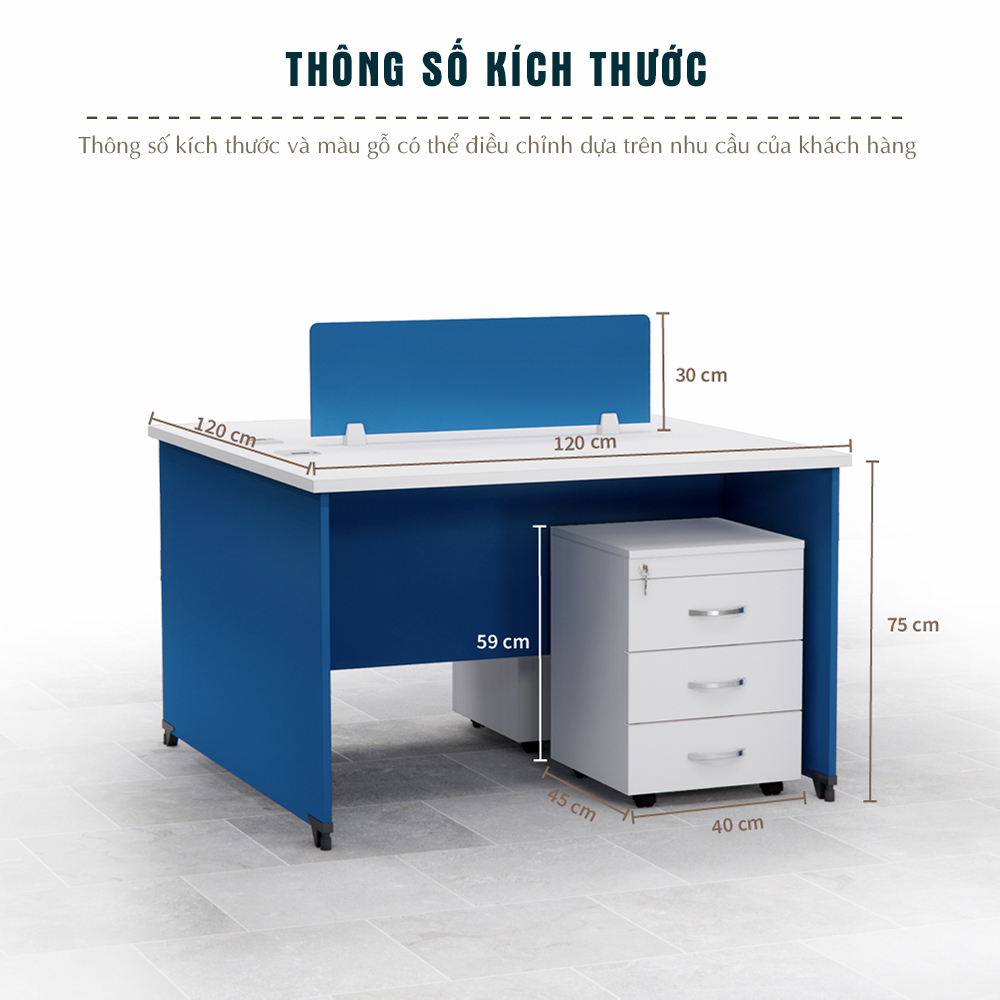 Mặt bàn: Gỗ MDF phủ Melamin – bề mặt mịn, dễ vệ sinh, màu sắc trang nhã và hạn chế trầy xước trong quá trình sử dụng