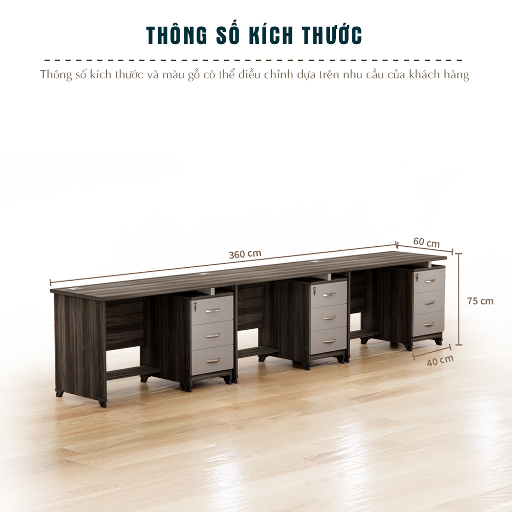 Màu sắc: Mặt bàn màu vân gỗ đậm sang trọng, hộc tủ phối màu ghi sáng nhã nhặn