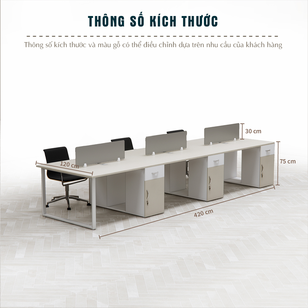 Bàn nhân viên cao cấp BKHOME FGBCNV013 là lựa chọn lý tưởng cho các doanh nghiệp đang tìm kiếm giải pháp tối ưu không gian làm việc nhóm. Thiết kế cụm 6 chỗ ngồi tích hợp vách ngăn giúp đảm bảo sự riêng tư, nâng cao hiệu suất công việc mà vẫn giữ được sự gọn gàng, chuyên nghiệp cho không gian văn phòng.