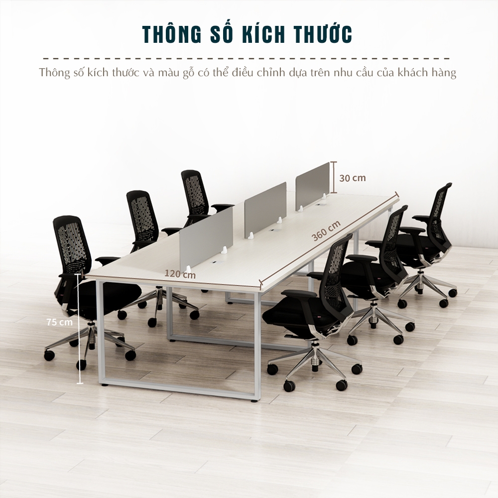 Tùy chỉnh theo yêu cầu: Khách hàng có thể lựa chọn màu sắc, thêm hộc tủ hoặc thay đổi vật liệu vách ngăn phù hợp với từng văn phòng.