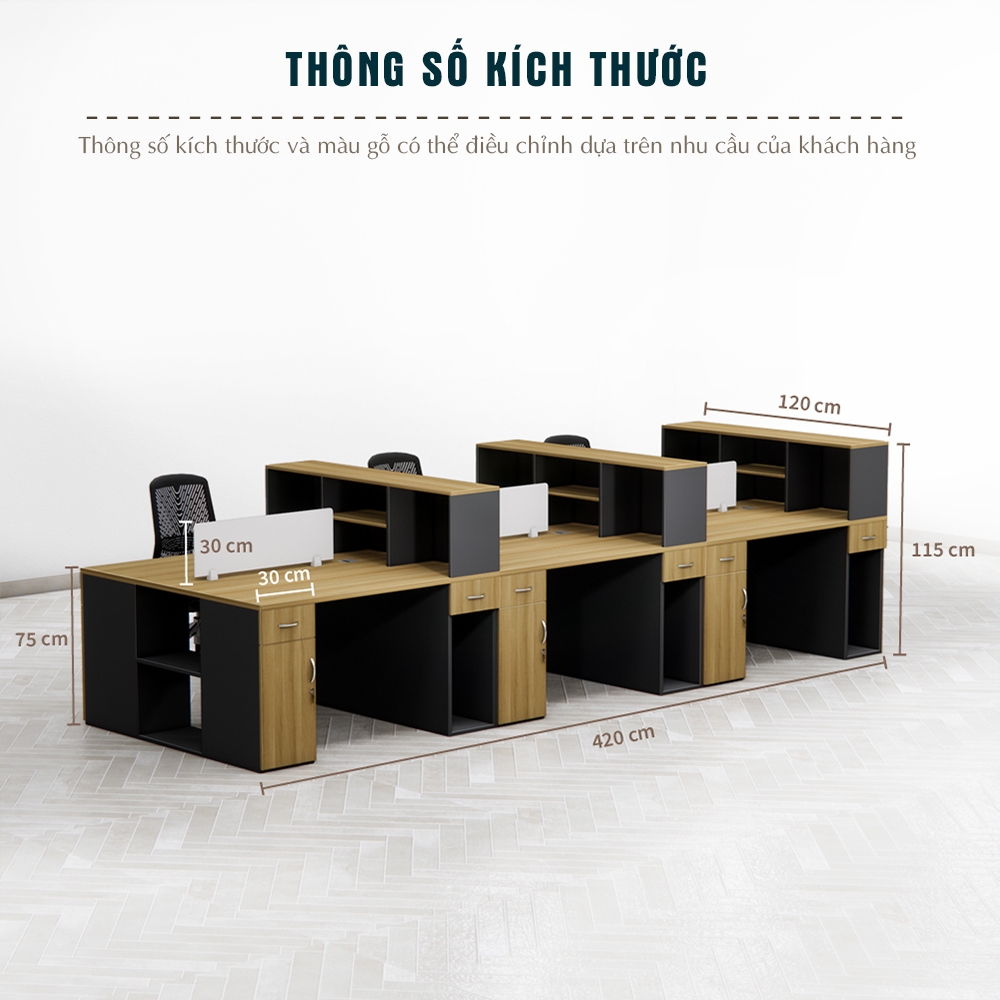 Kích thước bàn làm việc mỗi người: 120cm x 60cm x 75cm
