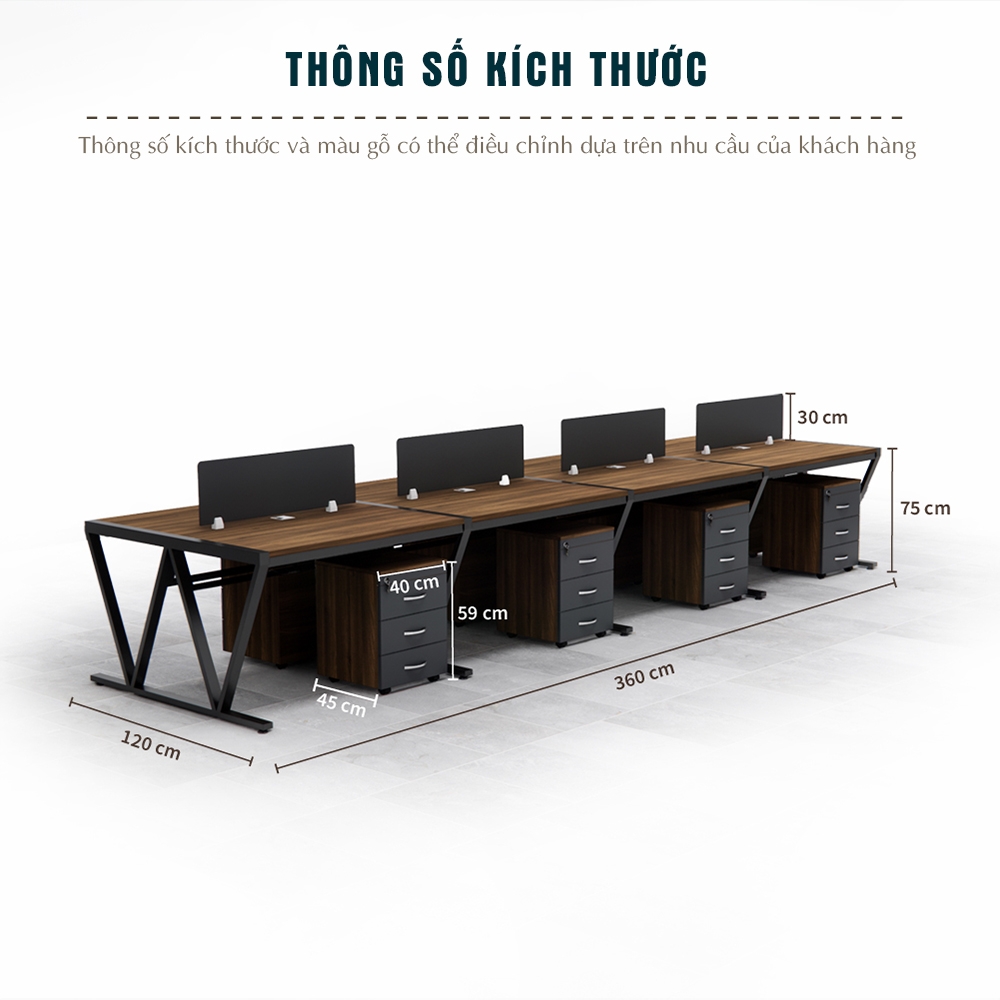 Vách ngăn: Cao 30 cm, tạo không gian làm việc riêng tư vừa đủ nhưng vẫn đảm bảo sự kết nối giữa các thành viên