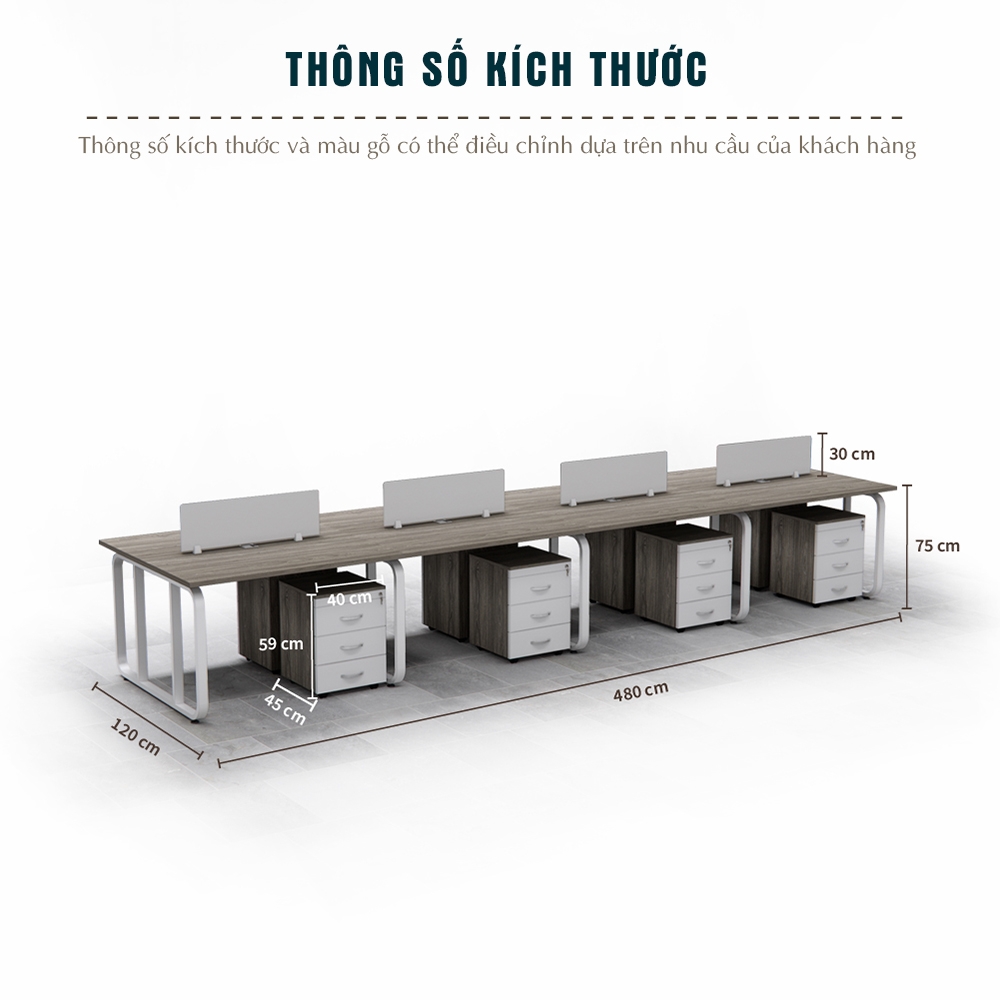Vách ngăn: Gỗ MDF Melamin đồng bộ, giúp tạo khoảng không riêng tư cho mỗi nhân viên mà không gây bí bách.