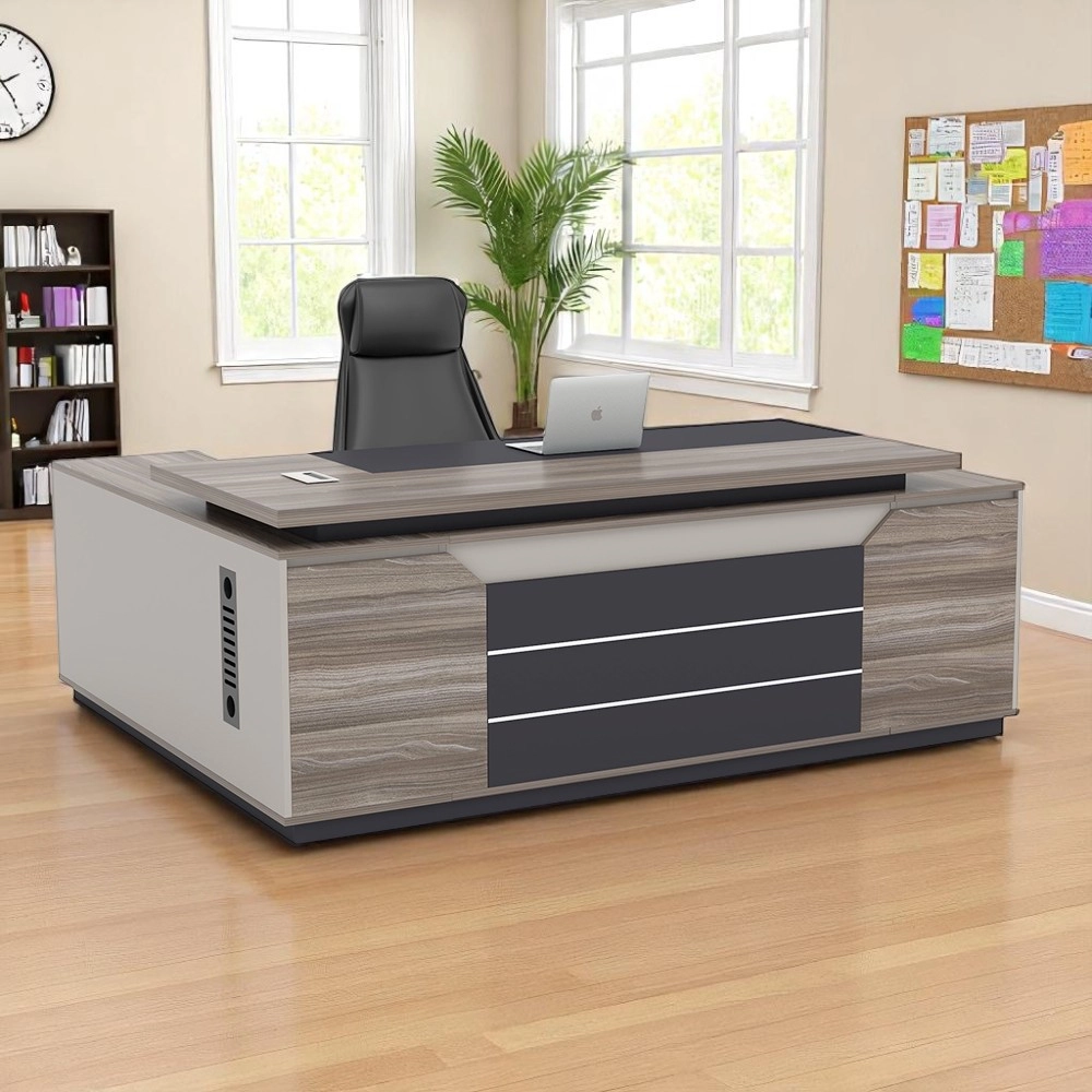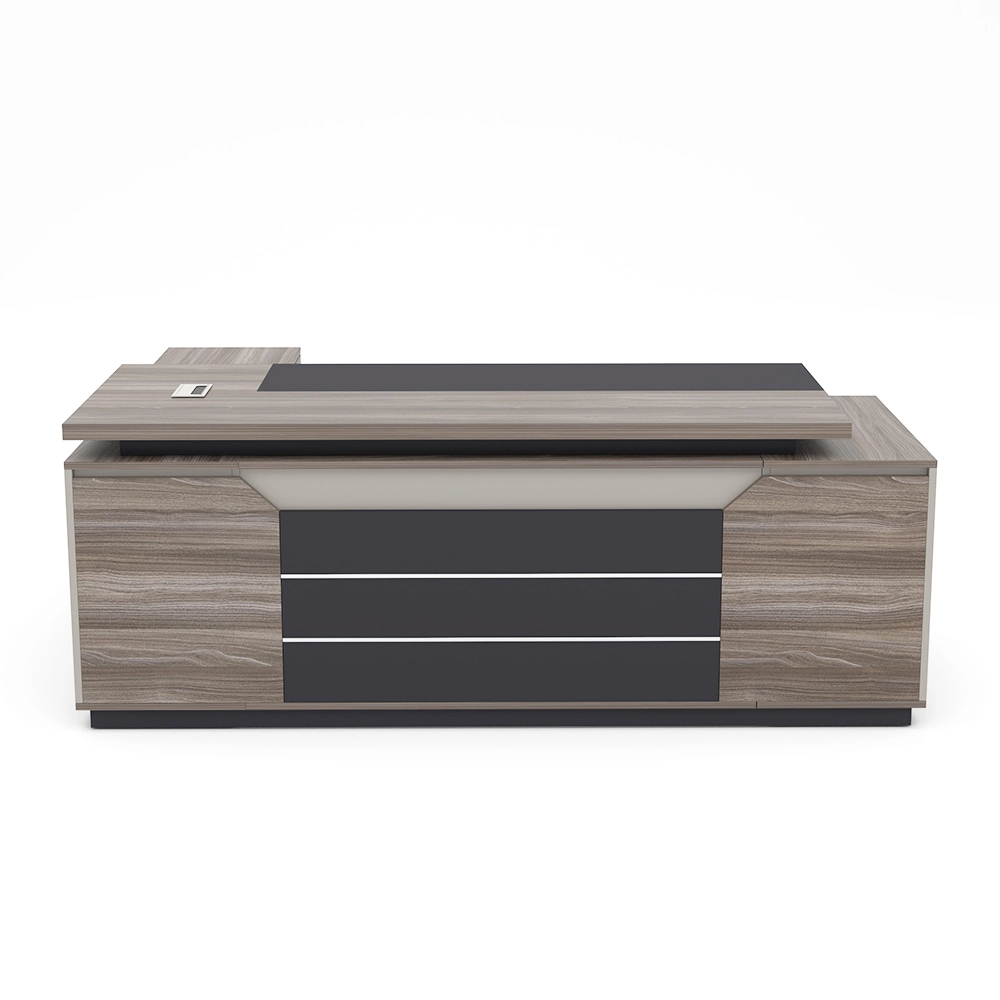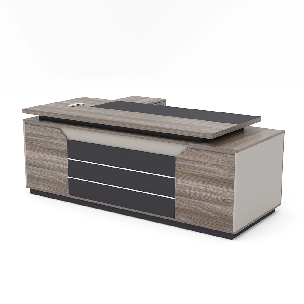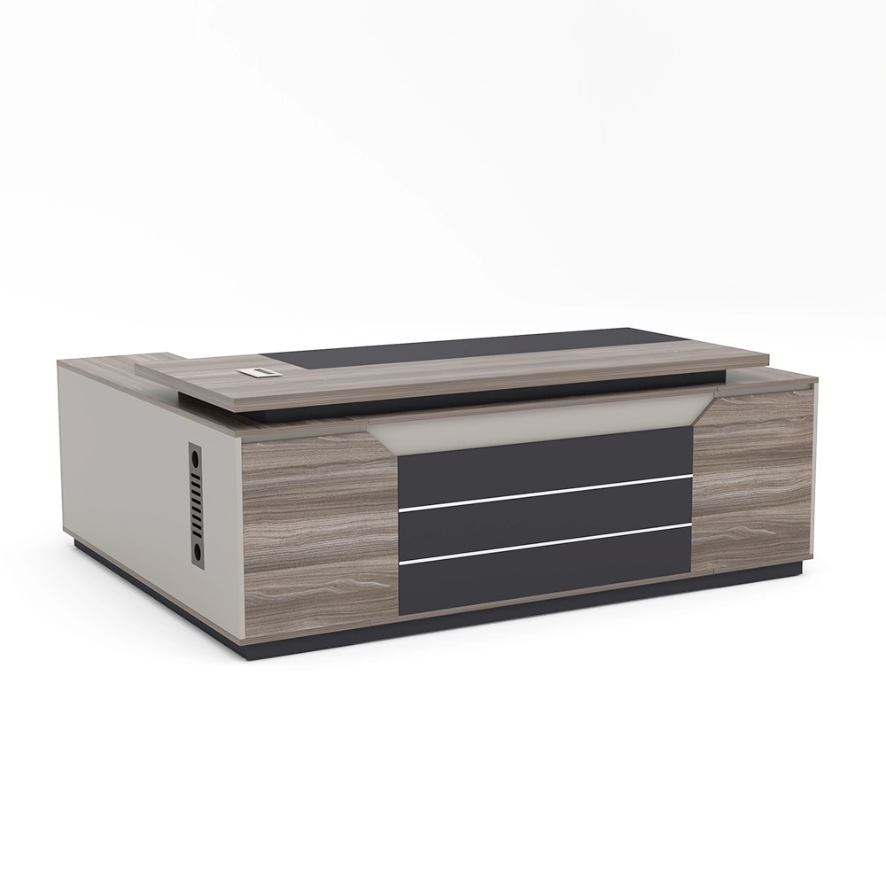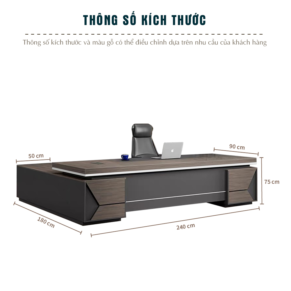 Bàn giám đốc FGBGD066 hiện có phối màu gỗ sẫm kết hợp xám hiện đại, phù hợp với nhiều không gian nội thất chuyên nghiệp. Ngoài ra, khách hàng có thể yêu cầu thay đổi màu sắc phù hợp với phong cách thương hiệu hoặc thiết kế tổng thể của văn phòng.