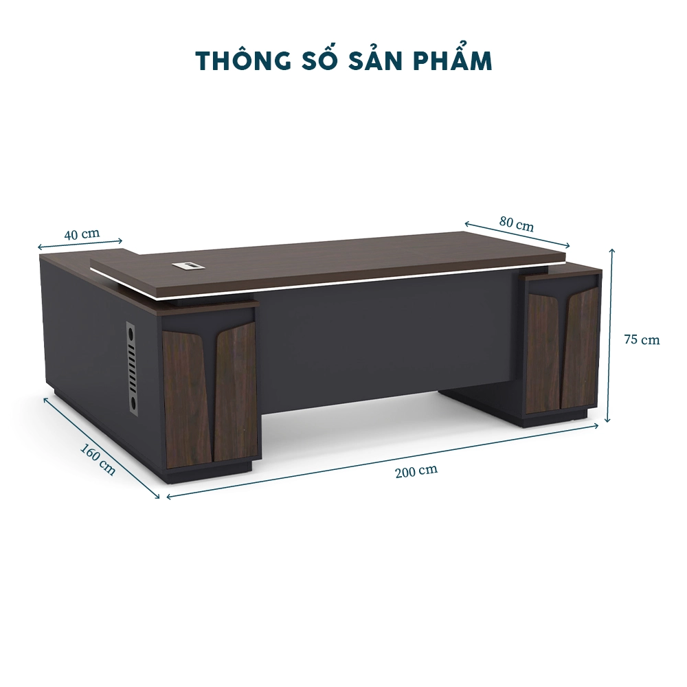 Tủ phụ bên trái bàn có chiều dài 180 cm, rộng 50 cm – phù hợp để lưu trữ hồ sơ, tài liệu, vật dụng cá nhân hoặc thiết bị văn phòng. Thiết kế này giúp tăng hiệu quả sử dụng không gian, giữ bàn làm việc luôn gọn gàng và ngăn nắp.
