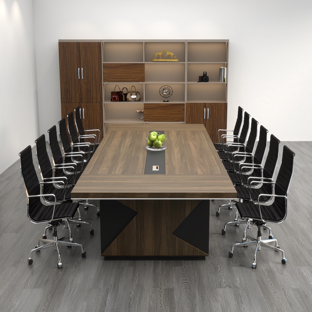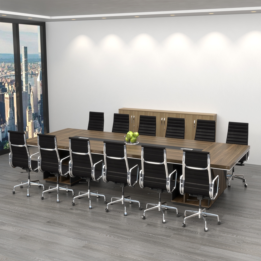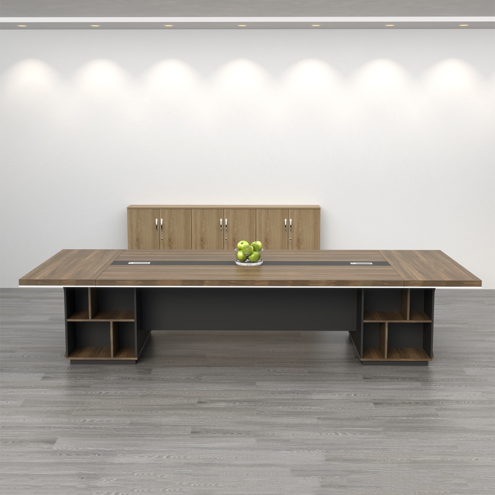 🔹 Thiết kế thông minh: Hệ chân bàn vững chắc kết hợp khoang tủ lưu trữ ở hai đầu giúp tận dụng tối đa công năng. Mặt bàn có bố trí khe kỹ thuật tiện lợi cho việc đi dây điện, đảm bảo sự gọn gàng trong suốt cuộc họp.