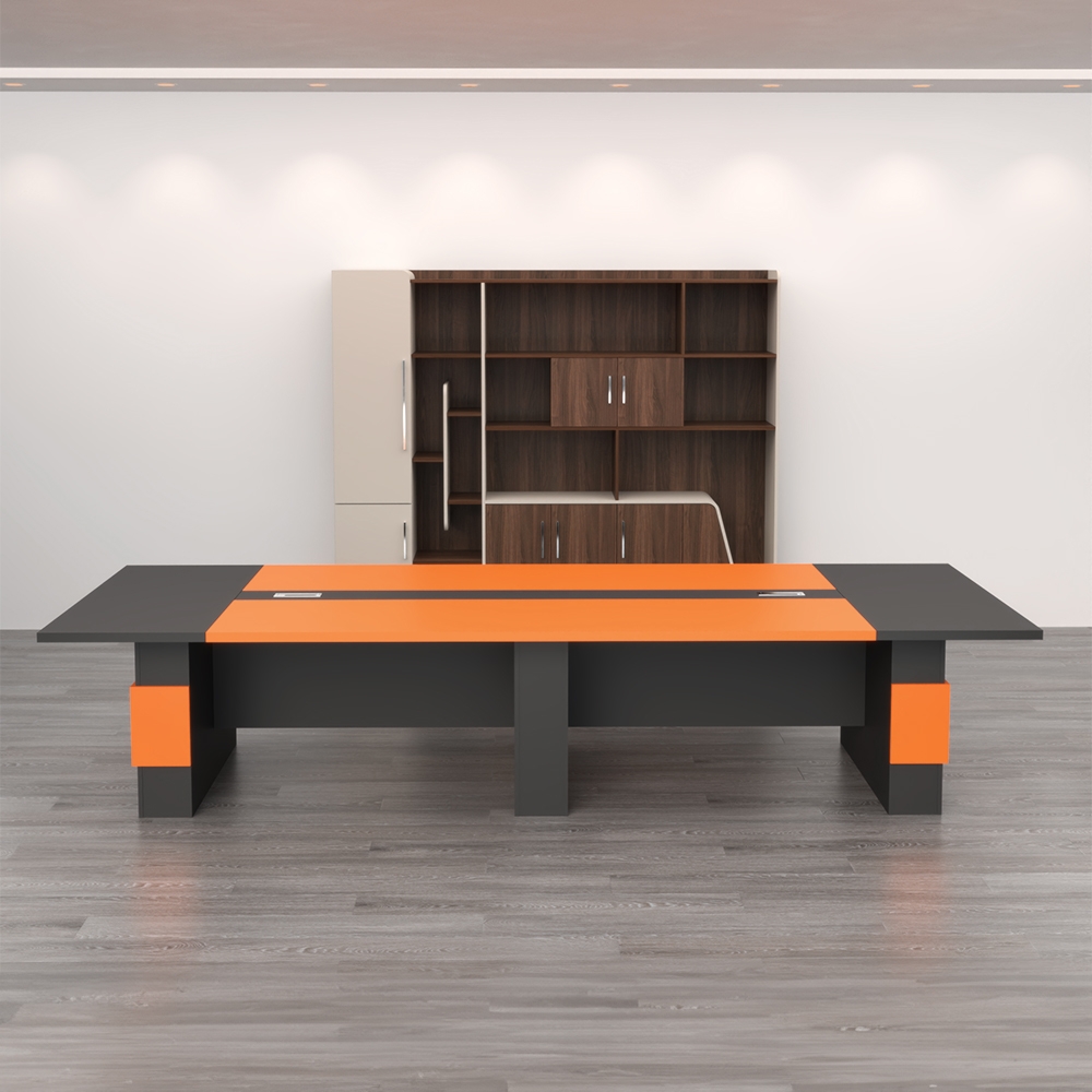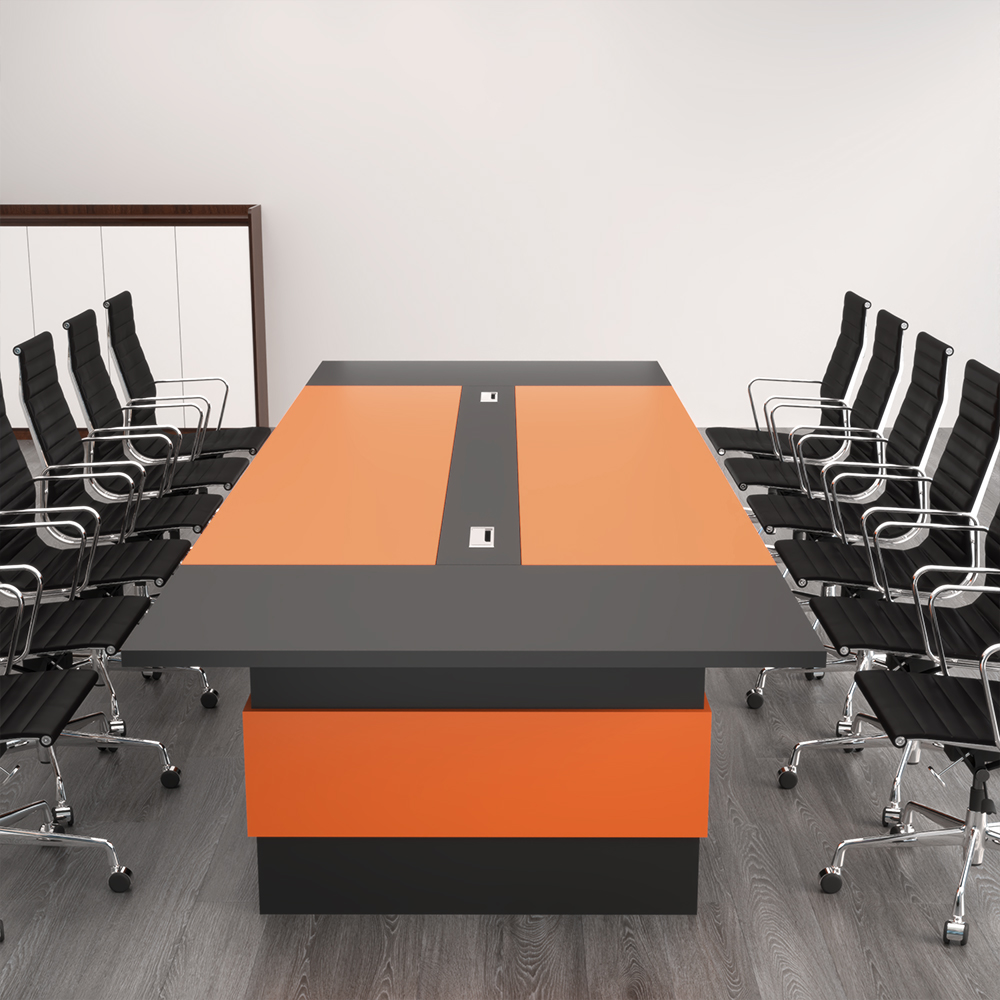 Bàn họp FGBH043 mang đến một lựa chọn khác biệt cho không gian họp nhờ thiết kế phối màu cam – đen trẻ trung, nổi bật nhưng vẫn giữ được sự cân đối và chuyên nghiệp. Sản phẩm được hoàn thiện từ gỗ MDF phủ Melamin, có khả năng giữ màu lâu, bề mặt nhẵn dễ lau chùi, phù hợp với môi trường làm việc năng động.