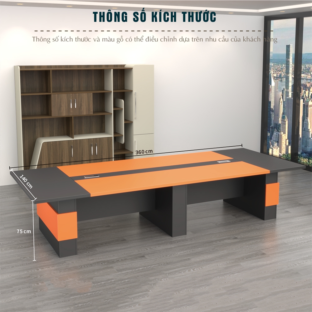 Kích thước tiêu chuẩn: Với chiều dài 3m6, bàn phù hợp cho nhóm họp từ 10–14 người, đảm bảo không gian rộng rãi khi làm việc