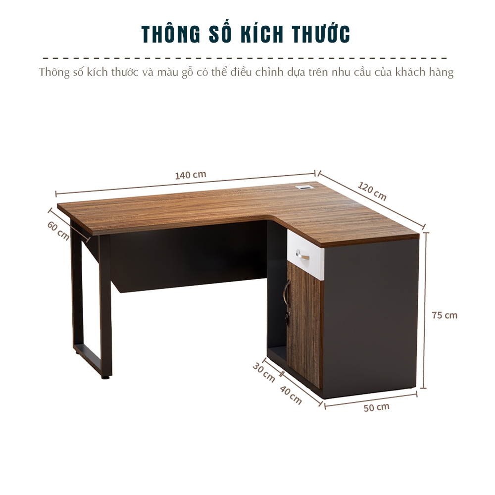 Thiết kế: Kiểu chữ L, tích hợp hộc tủ gồm ngăn kéo và khoang có khóa