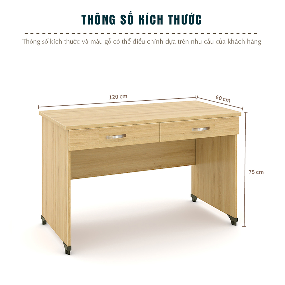 Thiết kế: 2 ngăn kéo liền bàn, tay nắm kim loại, không chiếm thêm diện tích