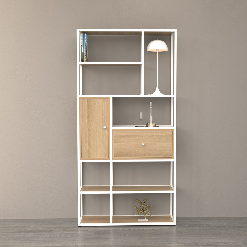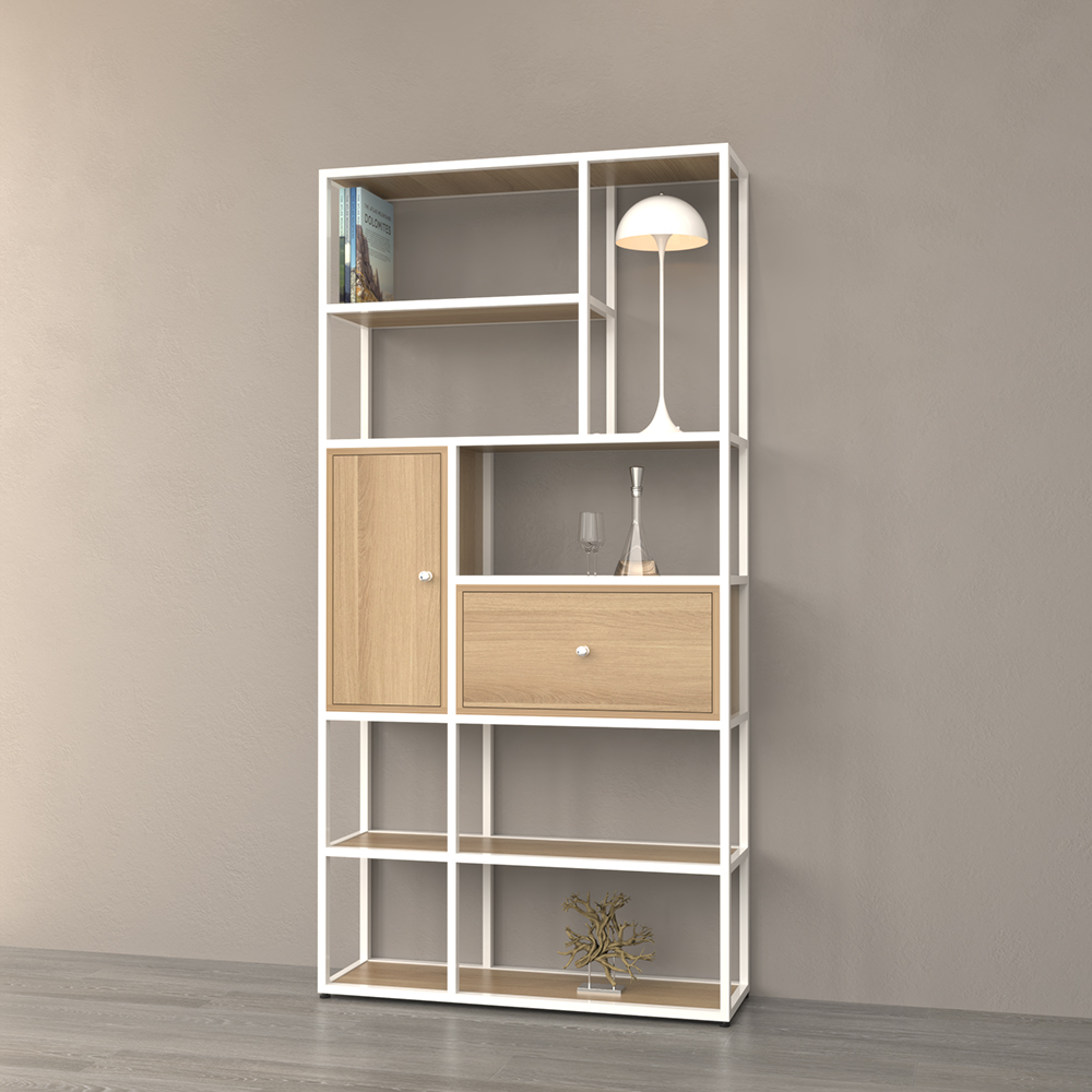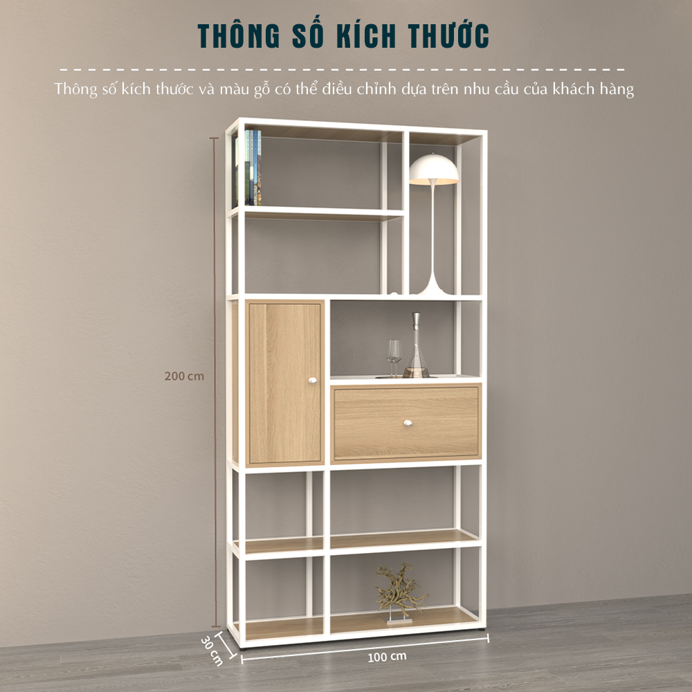Kệ trang trí FGKTT21 là giải pháp lý tưởng cho không gian cần sự linh hoạt giữa trưng bày và lưu trữ. Thiết kế nổi bật với khung sắt sơn trắng, kết hợp gỗ MDF phủ Melamin màu vân gỗ sáng. Sản phẩm gồm nhiều tầng để trưng bày cùng một ngăn kéo rộng và một tủ kín, đáp ứng nhu cầu sử dụng đa dạng. Mẫu kệ này phù hợp sử dụng tại văn phòng, phòng giám đốc, thư viện, showroom hoặc nhà ở theo phong cách hiện đại.