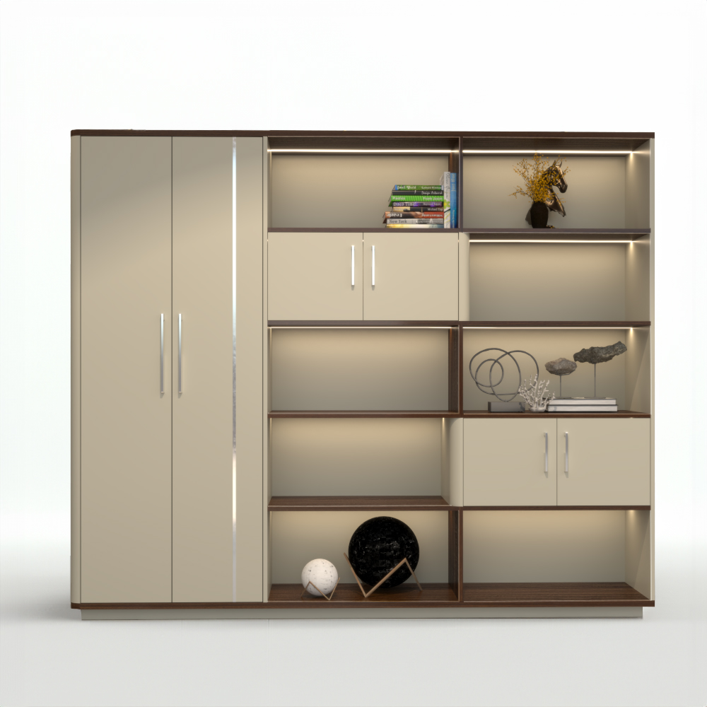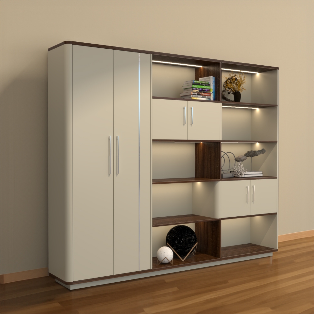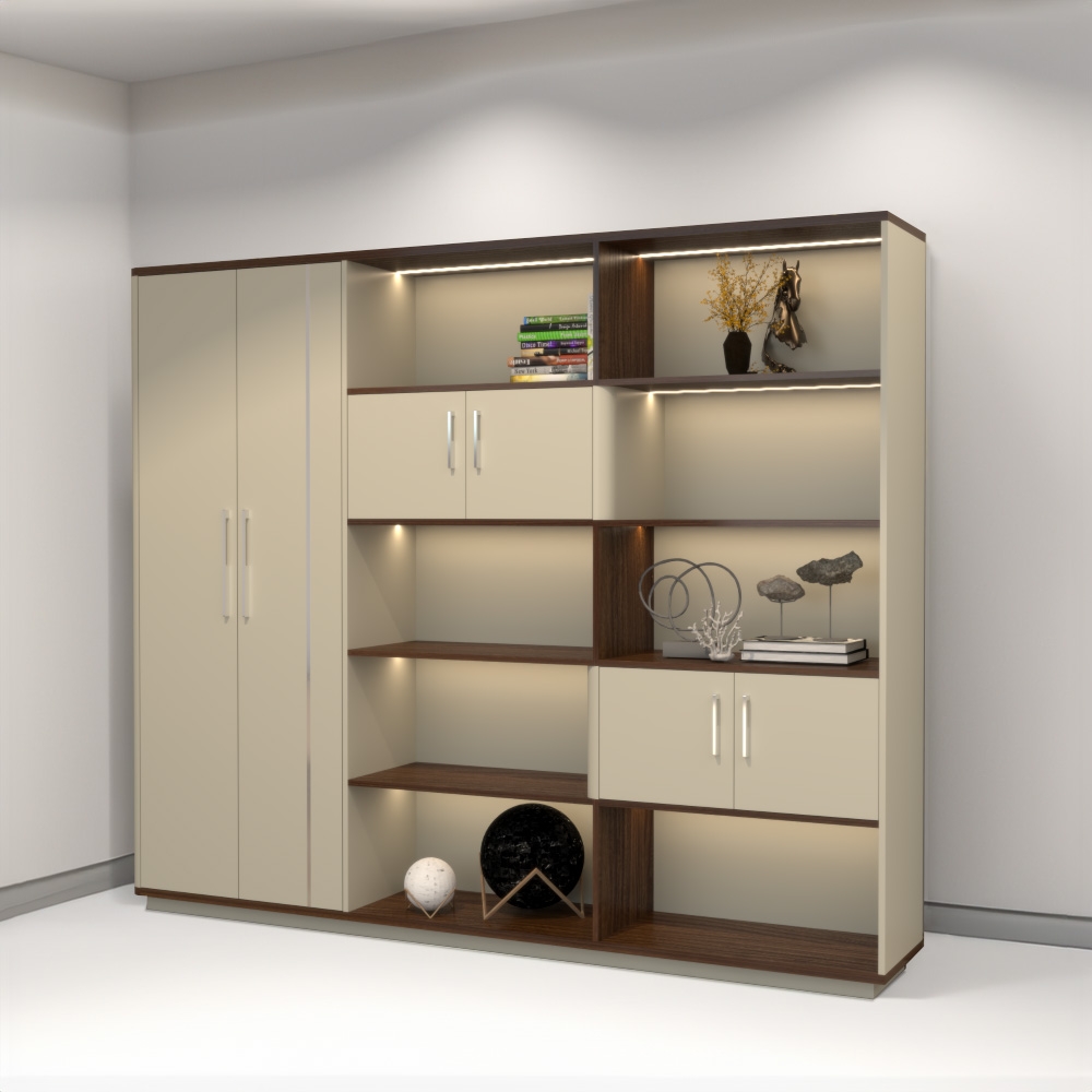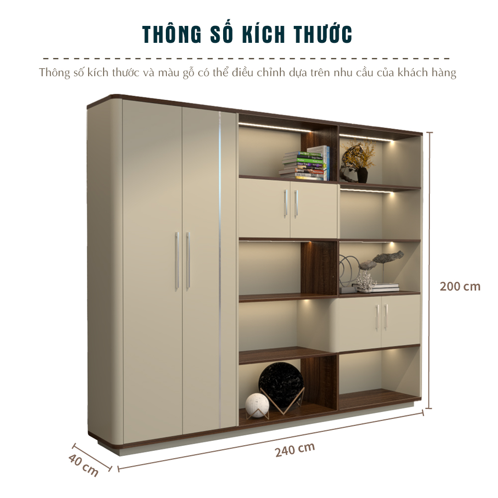 Thiết kế đa năng: Kết hợp linh hoạt giữa tủ cánh mở, ngăn kéo và kệ trưng bày – giúp lưu trữ hồ sơ, tài liệu, sách báo và vật phẩm trang trí một cách hiệu quả.
