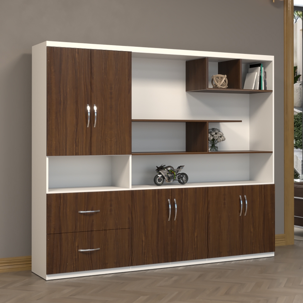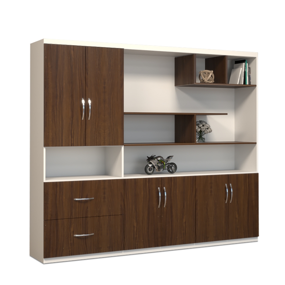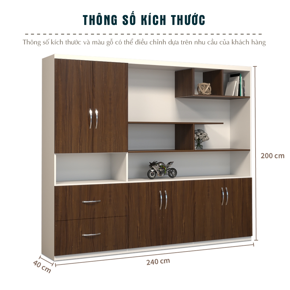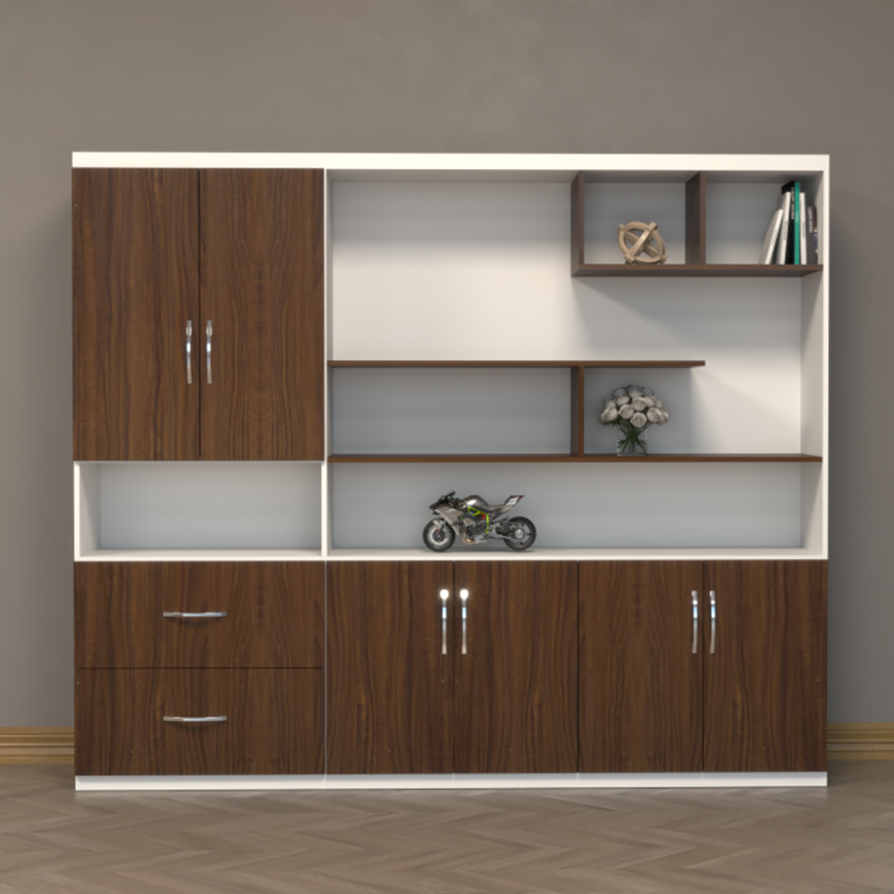 Cấu trúc tủ được chia thành nhiều khu vực lưu trữ bao gồm ngăn mở, tủ cánh, ngăn kéo và kệ sách, giúp sắp xếp tài liệu, sách vở, vật phẩm cá nhân hay đồ trang trí một cách khoa học, gọn gàng. Đây là lựa chọn phù hợp cho doanh nghiệp đang tìm kiếm sản phẩm có tính ứng dụng cao trong môi trường văn phòng chuyên nghiệp.