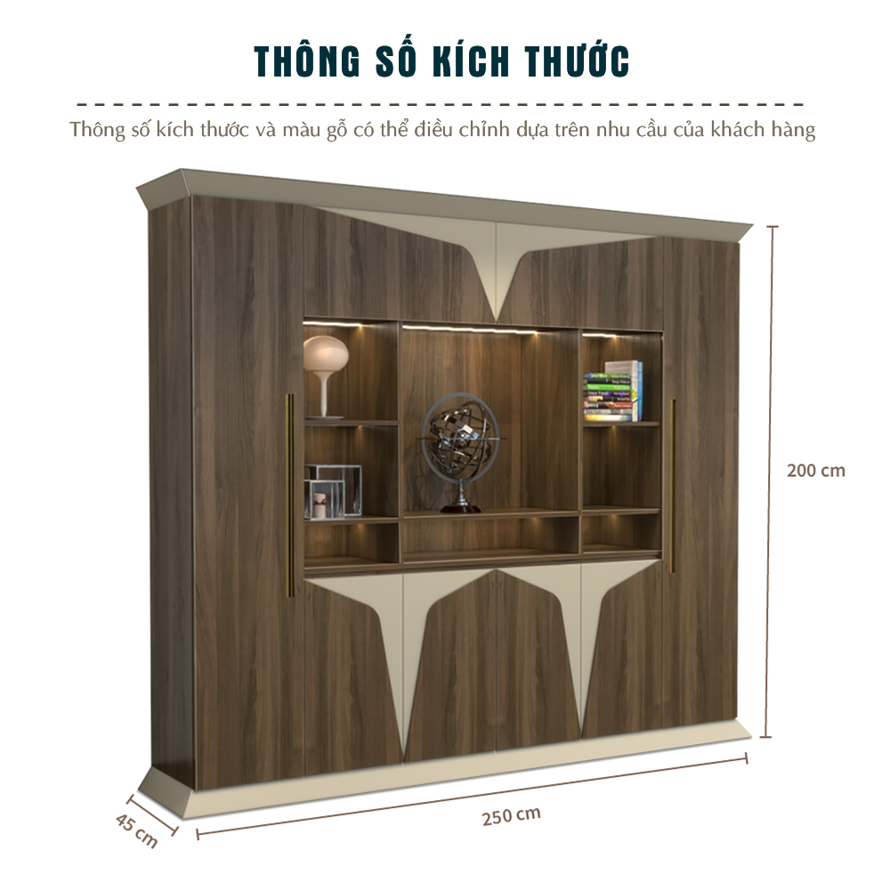 Kích thước tổng thể: Dài 250 cm × Cao 200 cm × Sâu 45 cm