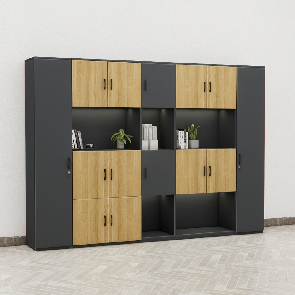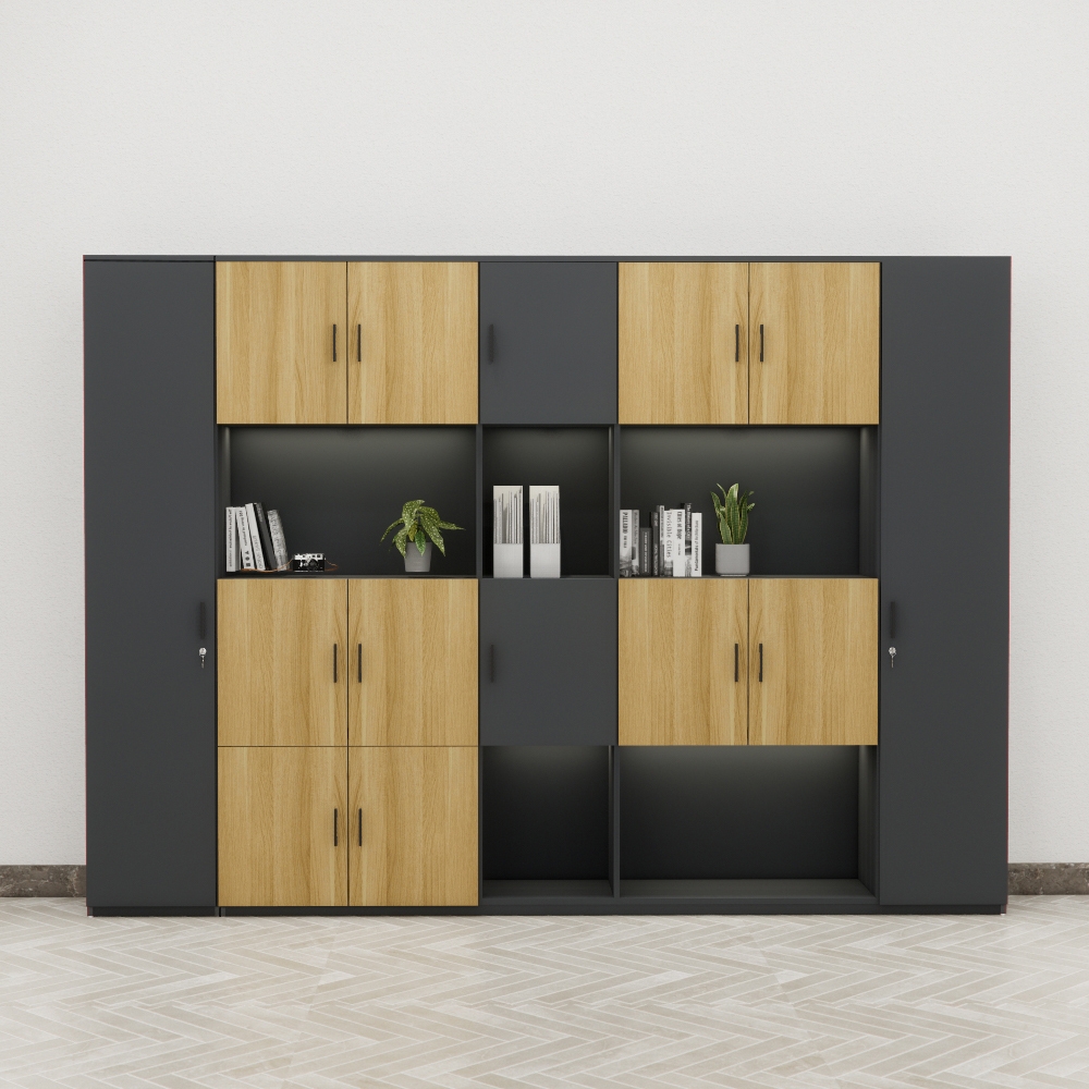 Tủ giám đốc BKHOME FGTGD034 được thiết kế với kích thước lớn, chia khoang khoa học, phù hợp cho những không gian văn phòng điều hành yêu cầu cao về lưu trữ và thẩm mỹ. Sản phẩm nổi bật với sự kết hợp giữa gam màu đen trung tính và màu vân gỗ sáng, mang lại cảm giác hiện đại, gần gũi và dễ kết hợp với các mẫu bàn ghế trong cùng không gian.
