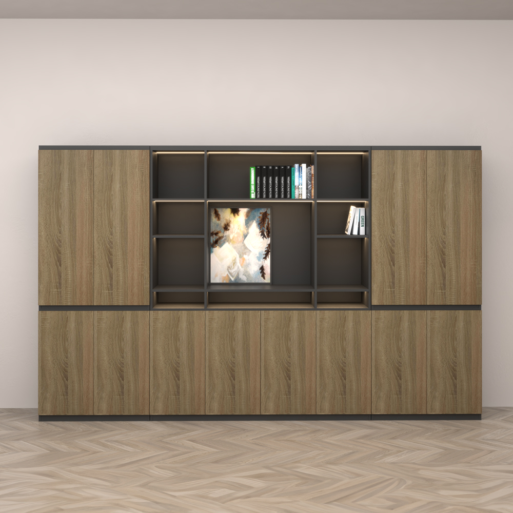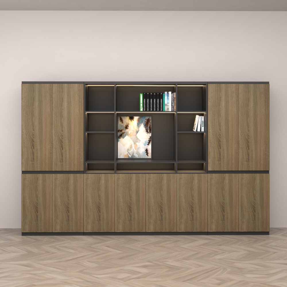 Điểm nổi bật của sản phẩm nằm ở hệ thống đèn LED âm kệ giúp tăng tính thẩm mỹ, đồng thời hỗ trợ ánh sáng trong quá trình sử dụng. Cấu trúc tủ chia thành các khoang rõ ràng, thuận tiện trong việc phân loại và sắp xếp hồ sơ, sách, vật dụng trang trí hoặc vật phẩm doanh nghiệp.