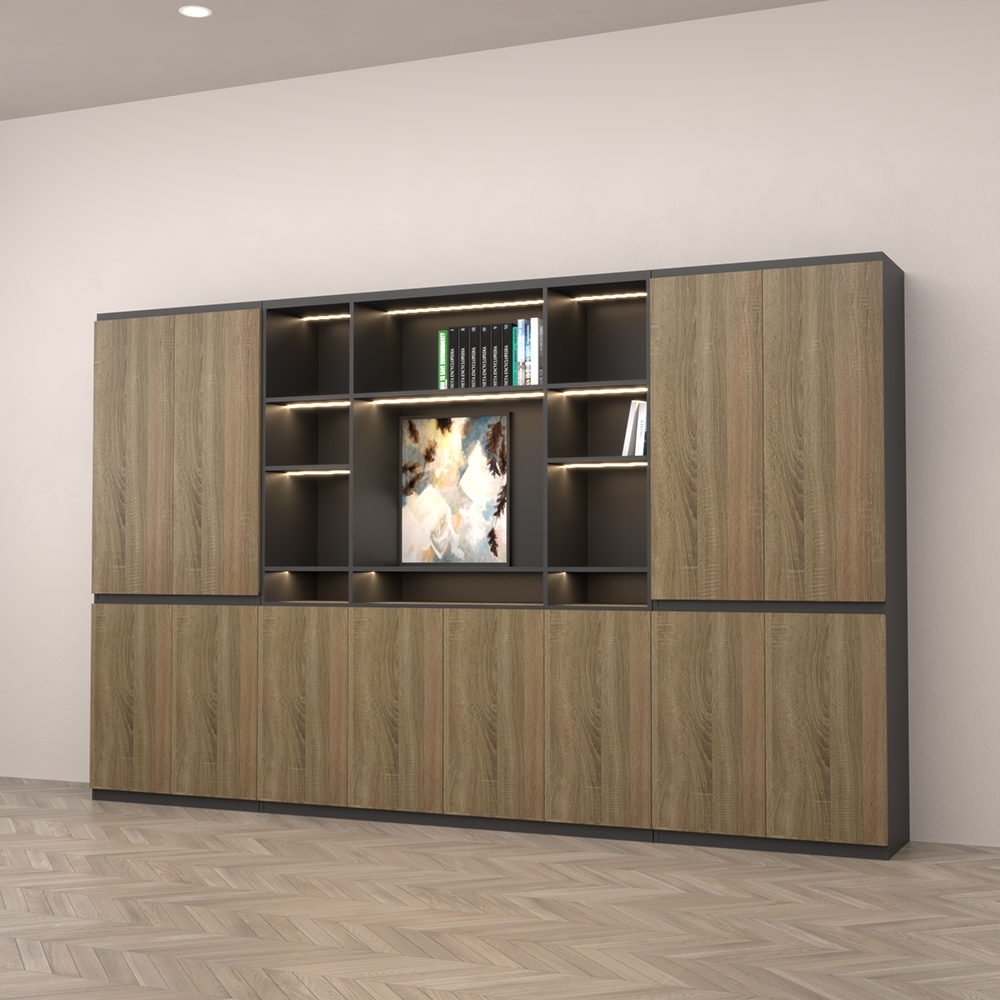 Khu vực trung tâm gồm các kệ mở có đèn LED trang trí – phù hợp để sách, vật phẩm kỷ niệm hoặc vật trang trí văn phòng