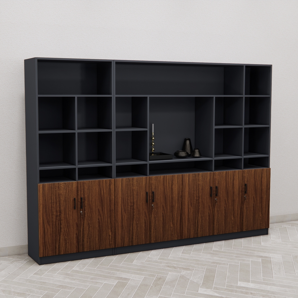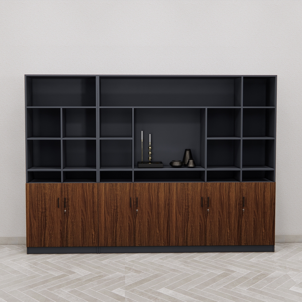 Phần dưới là hệ tủ cánh kín với 6 khoang độc lập, hỗ trợ lưu trữ hồ sơ, tài liệu và vật dụng cần sự riêng tư