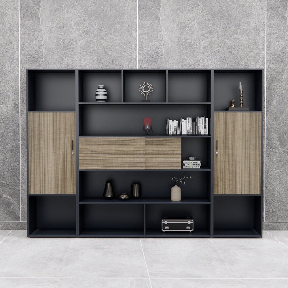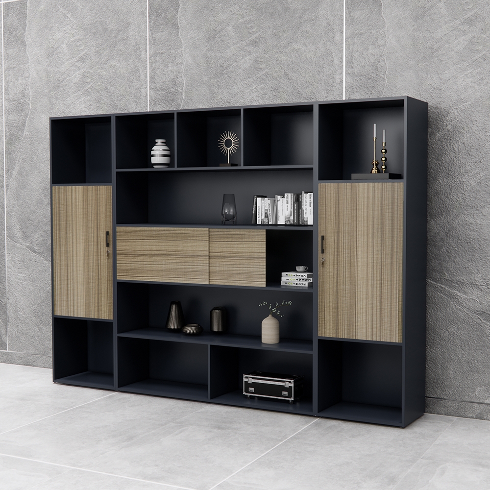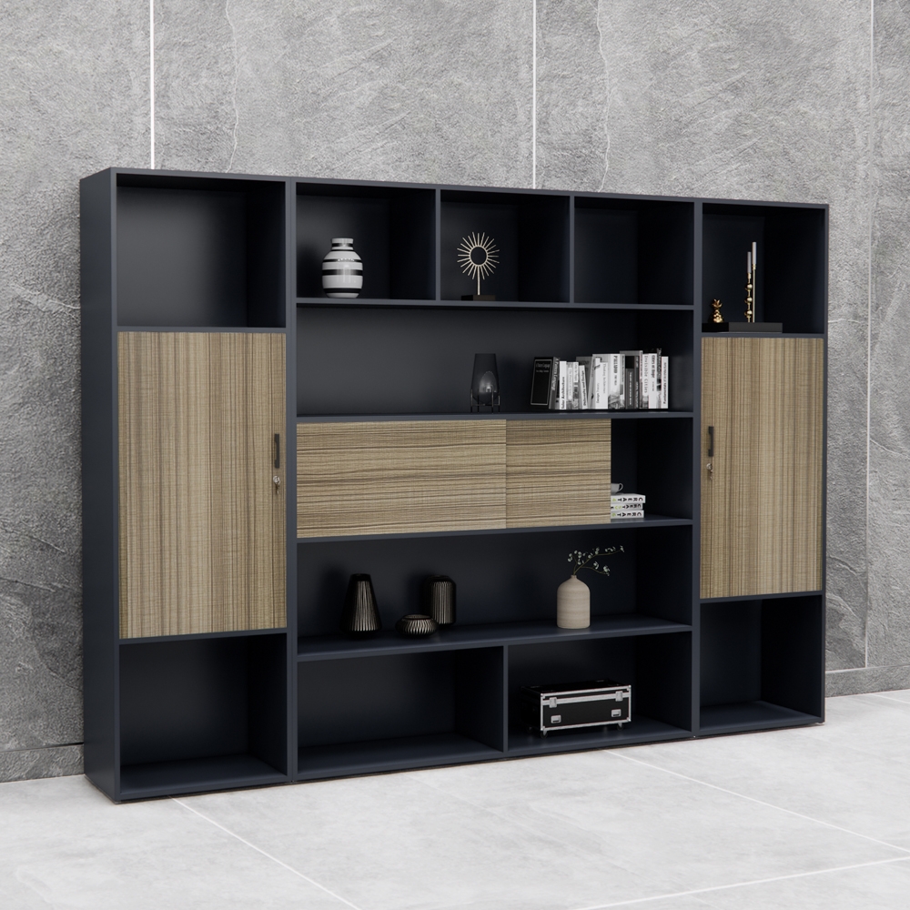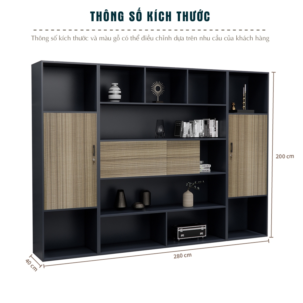 Phân chia công năng hợp lý: Tủ bao gồm nhiều khoang mở, tủ cánh trượt và tủ khóa giúp linh hoạt trong việc lưu trữ tài liệu, vật dụng cá nhân hoặc trưng bày trang trí
