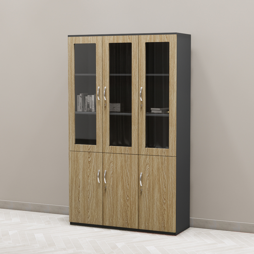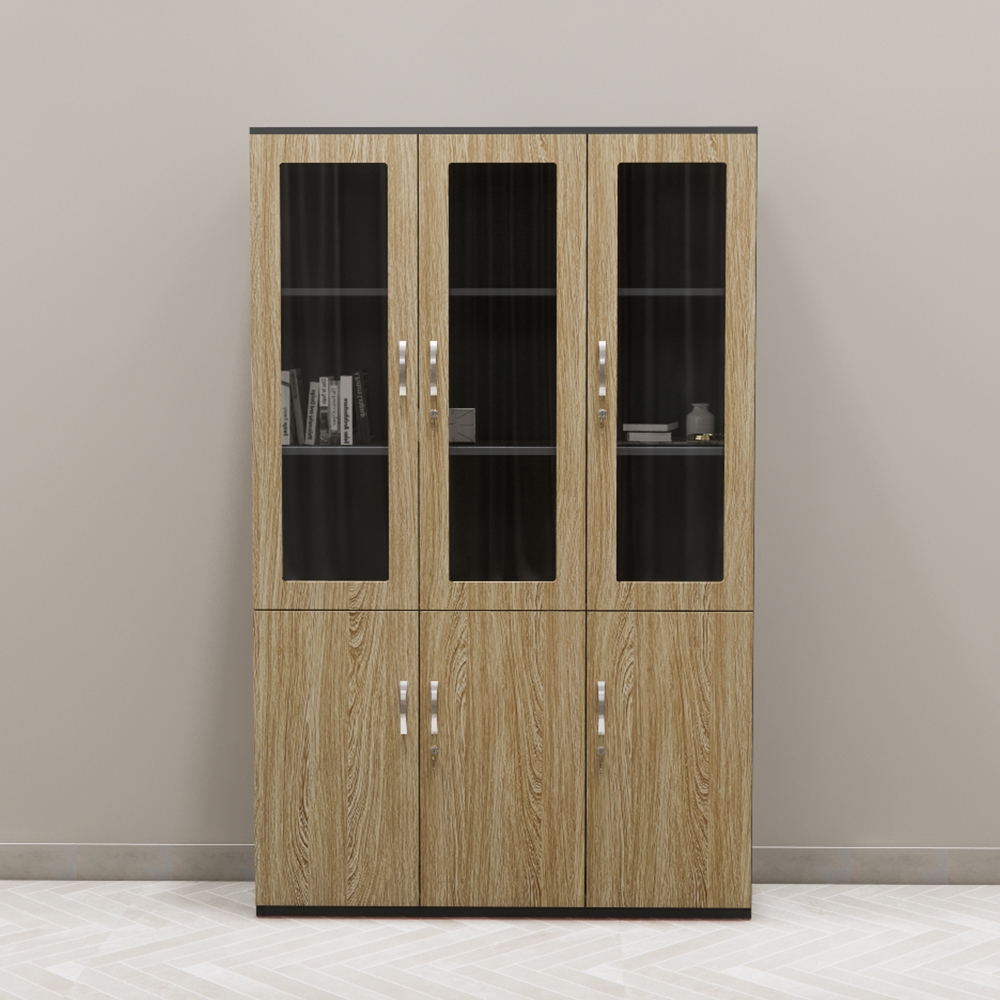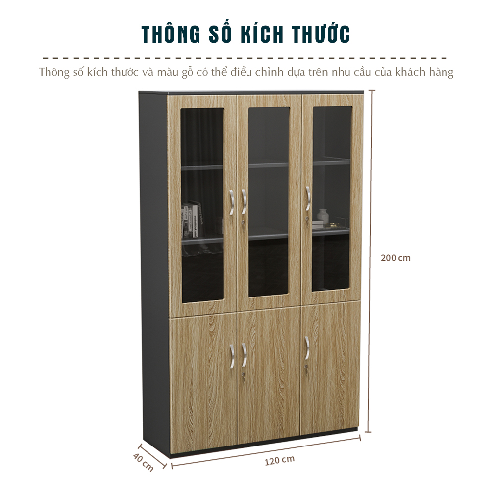 Chia khoang hợp lý: Tầng trên với 3 cánh kính phù hợp trưng bày sách, tài liệu hoặc vật dụng thường dùng. Tầng dưới gồm 3 cánh gỗ kín để lưu giữ hồ sơ, hồ sơ nội bộ hoặc thiết bị văn phòng